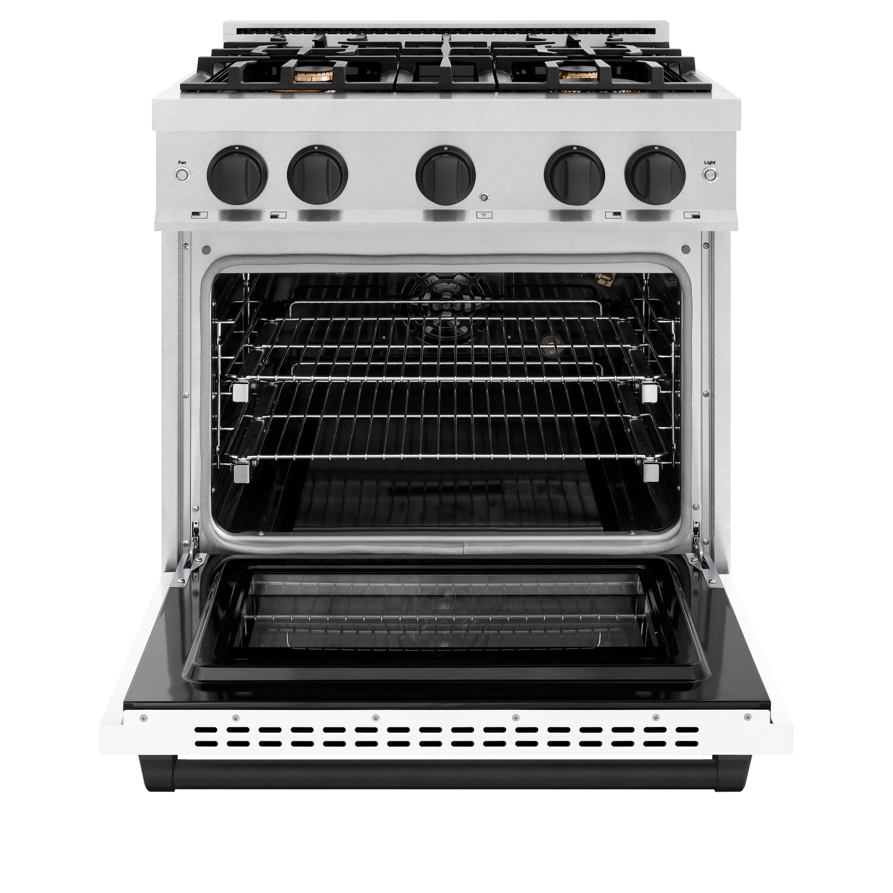 Luxury isn’t meant to be left desired—it’s meant to be attainable. The ZLINE Autograph Edition 30 in. 4.2 cu. ft. Select Gas Range with 4 Burner Cooktop and Convection Gas Oven in Satin Stainless Steel with White Matte Door and Matte Black Accents (HGRSZ-WM-30-MB) combines the elegance of a hand-finished porcelain gas cooktop with 4 Italian-made auto-reignition burners, a gas convection oven with an energy-efficient cooling fan to ensure quiet operation, a beautiful white matte door with a Horizon window design, and stunning matte black knobs and handle allowing you to master every meal. With a modern, timeless style and refined functionality, ZLINE Select Gas Ranges are masterfully crafted to deliver an elevated culinary experience.