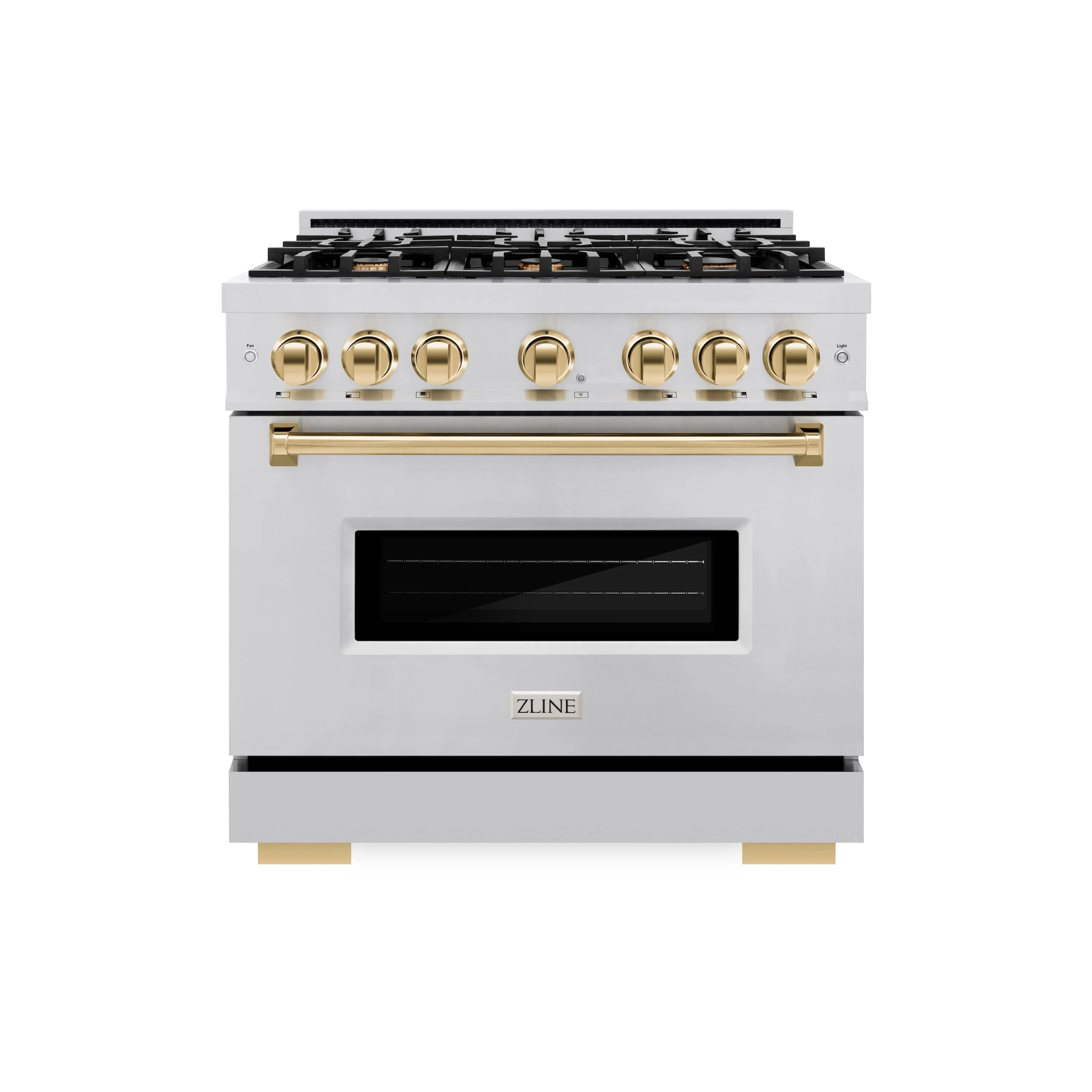 Luxury isn’t meant to be desired - it’s meant to be attainable. The ZLINE Autograph Edition 36 in. 5.2 cu. ft. Classic Gas Range with 6 Burner Cooktop and Convection Gas Oven in Stainless Steel and Polished Gold Accents (CGRZ-36-G) combines the elegance of a hand-finished porcelain gas cooktop with 6 Italian-made auto-reignition burners, a gas convection oven with an energy-efficient cooling fan to ensure quiet operation, a Landscape oven door window design, and stunning polished gold knobs and handle allowing you to master every meal. With a modern, timeless style and refined functionality, ZLINE Classic Gas Ranges are masterfully crafted to deliver an elevated culinary experience.