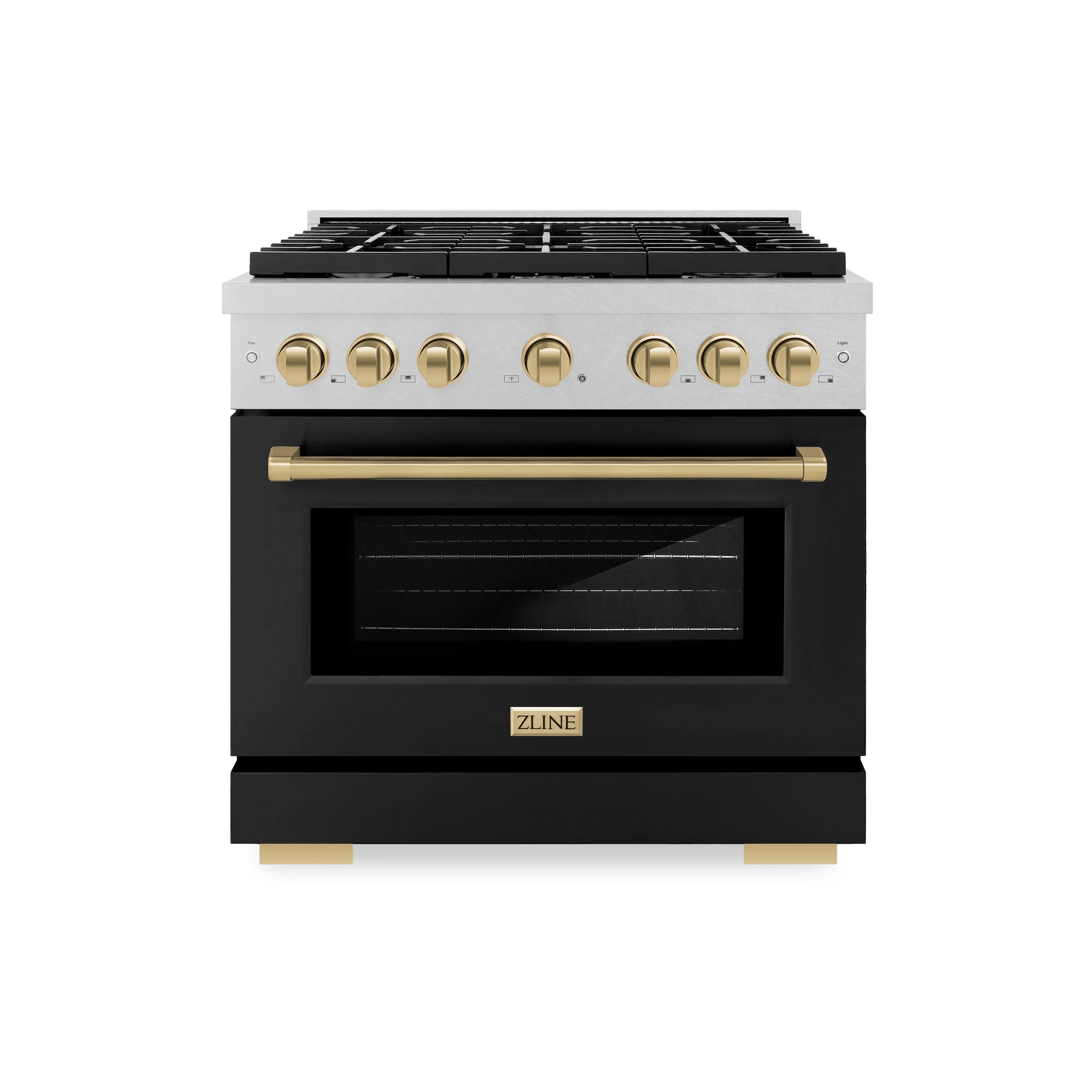 ZLINE - Autograph Edition 36 in. 5.2 cu. ft. Paramount Gas Range with 6 Burner Cooktop and Convection Gas Oven in Satin Stainless Steel with Black Matte Door and Champagne Bronze Accents