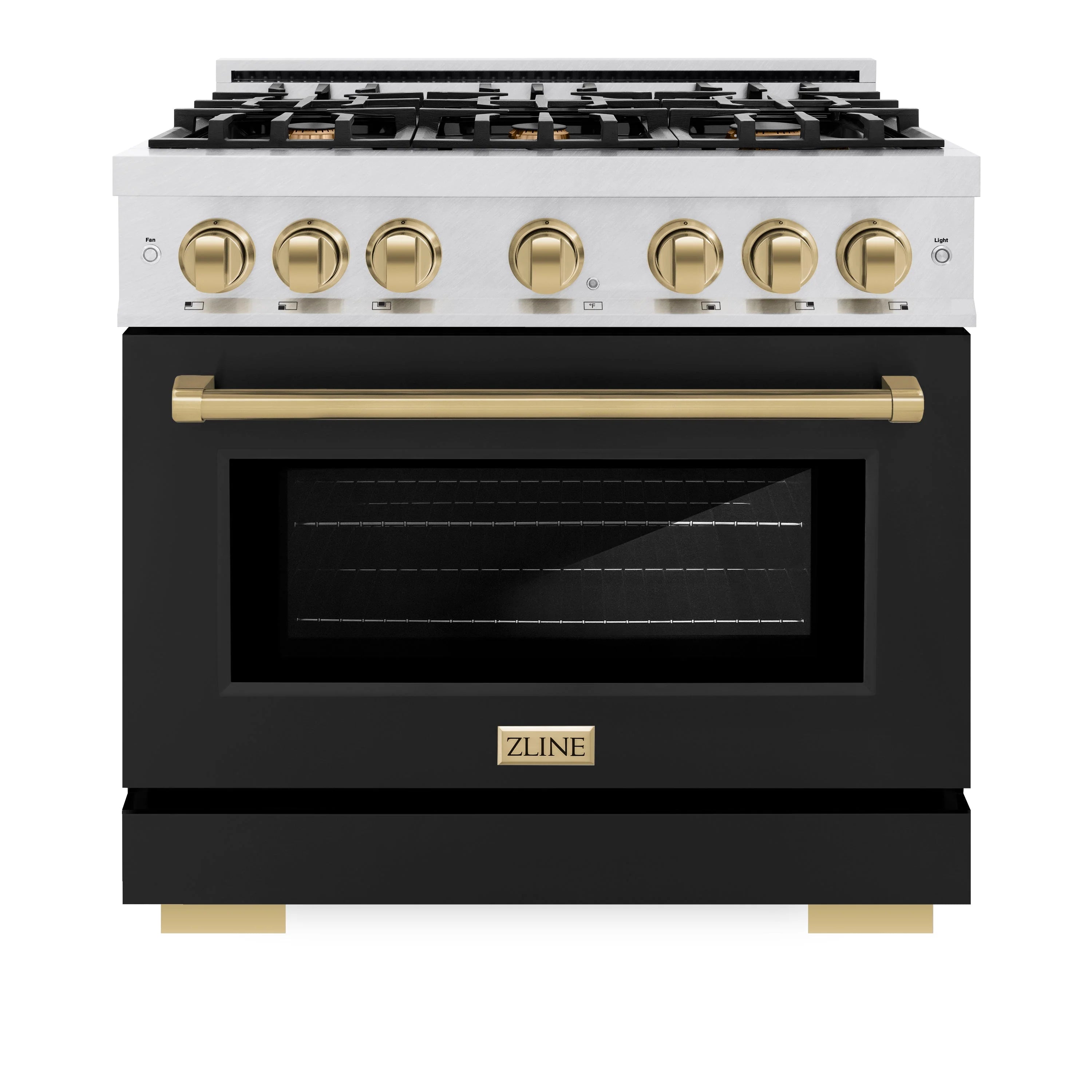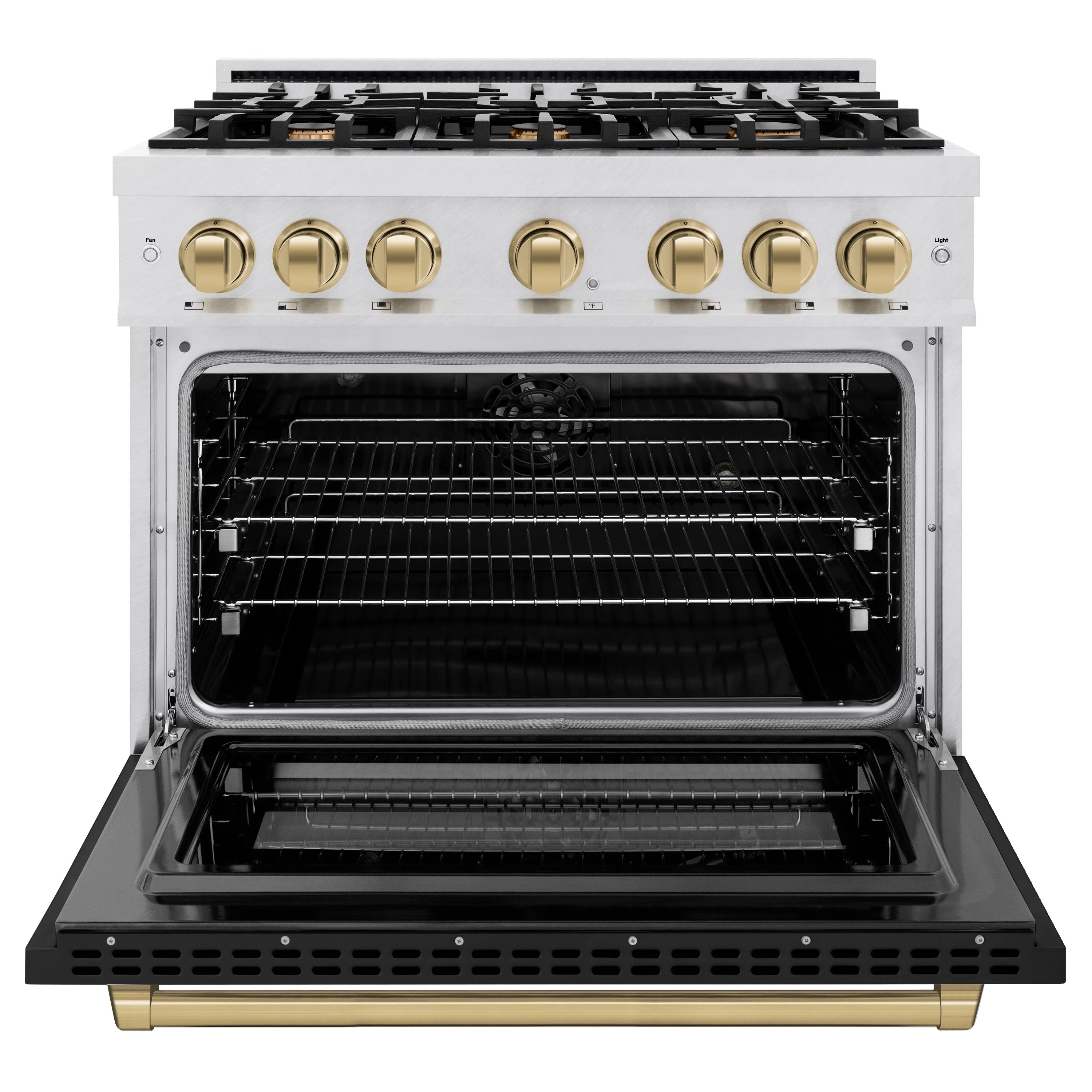 Luxury isn’t meant to be left desired—it’s meant to be attainable. The ZLINE Autograph Edition 36 in. 5.2 cu. ft. Select Dual Fuel Range with 6 Burner Gas Cooktop and Electric Convection Oven in Satin Stainless Steel with Black Matte Door and Champagne Bronze Accents (HDRSZ-BLM-36-CB) combines the elegance of a hand-finished porcelain gas cooktop with 6 Italian-made auto-reignition burners, an electric convection oven with an energy-efficient cooling fan to ensure quiet operation, a beautiful black matte door with a Horizon window design, and stunning champagne bronze knobs and handle allowing you to master every mea