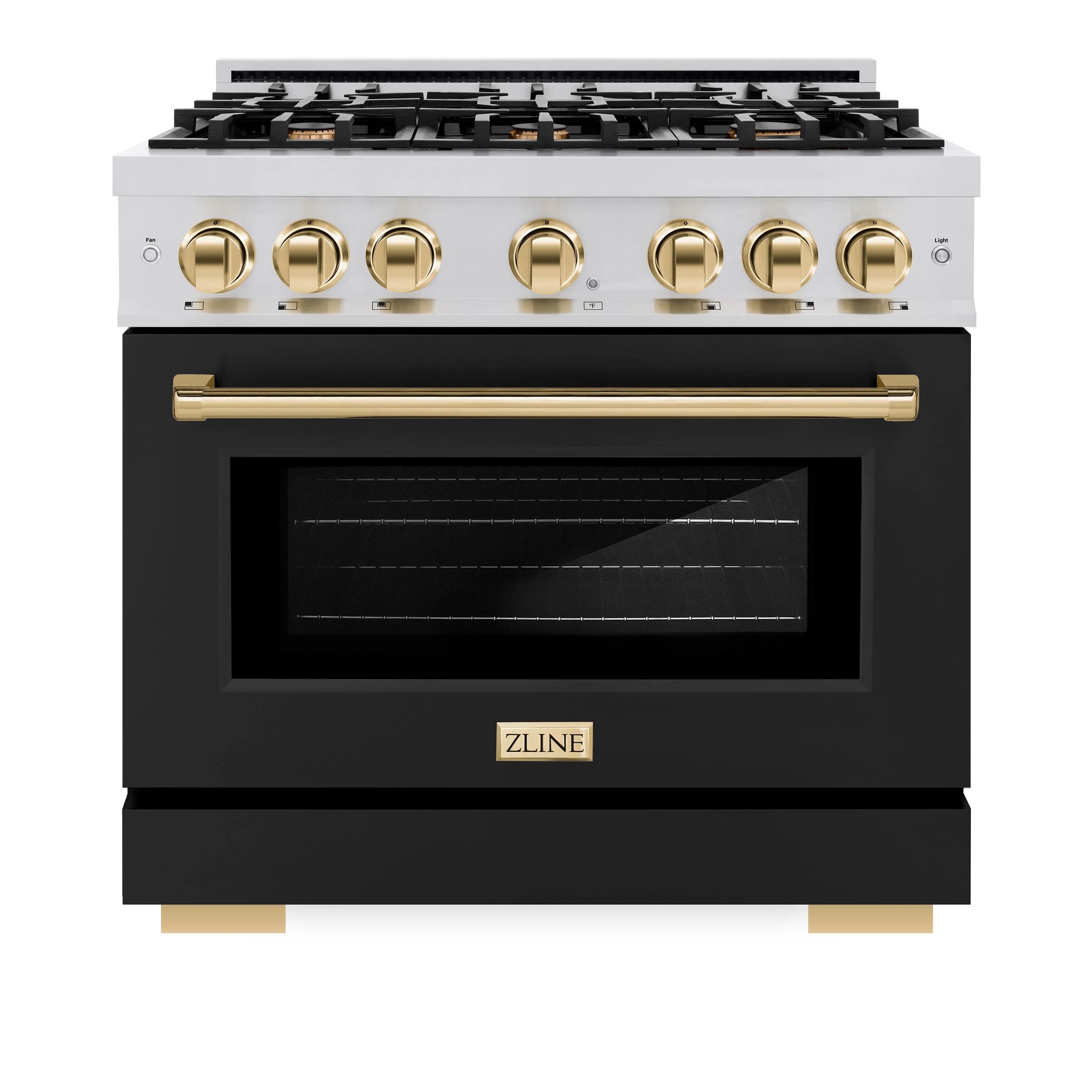 Luxury isn’t meant to be desired - it’s meant to be attainable. The ZLINE Autograph Edition 36 in. 5.2 cu. ft. Select Dual Fuel Range with 6 Burner Gas Cooktop and Electric Convection Oven in Stainless Steel with Black Matte Door and Polished Gold Accents (HDRZ-BLM-36-G) combines the elegance of a hand-finished porcelain gas cooktop with 6 Italian-made auto-reignition burners, an electric convection oven with an energy-efficient cooling fan to ensure quiet operation, a beautiful black matte door with a Horizon window design, and stunning polished gold knobs and handle allowing you to master every meal. With a modern, timeless style and refined functionality, ZLINE Select Dual Fuel Ranges are masterfully crafted to deliver an elevated culinary experience.