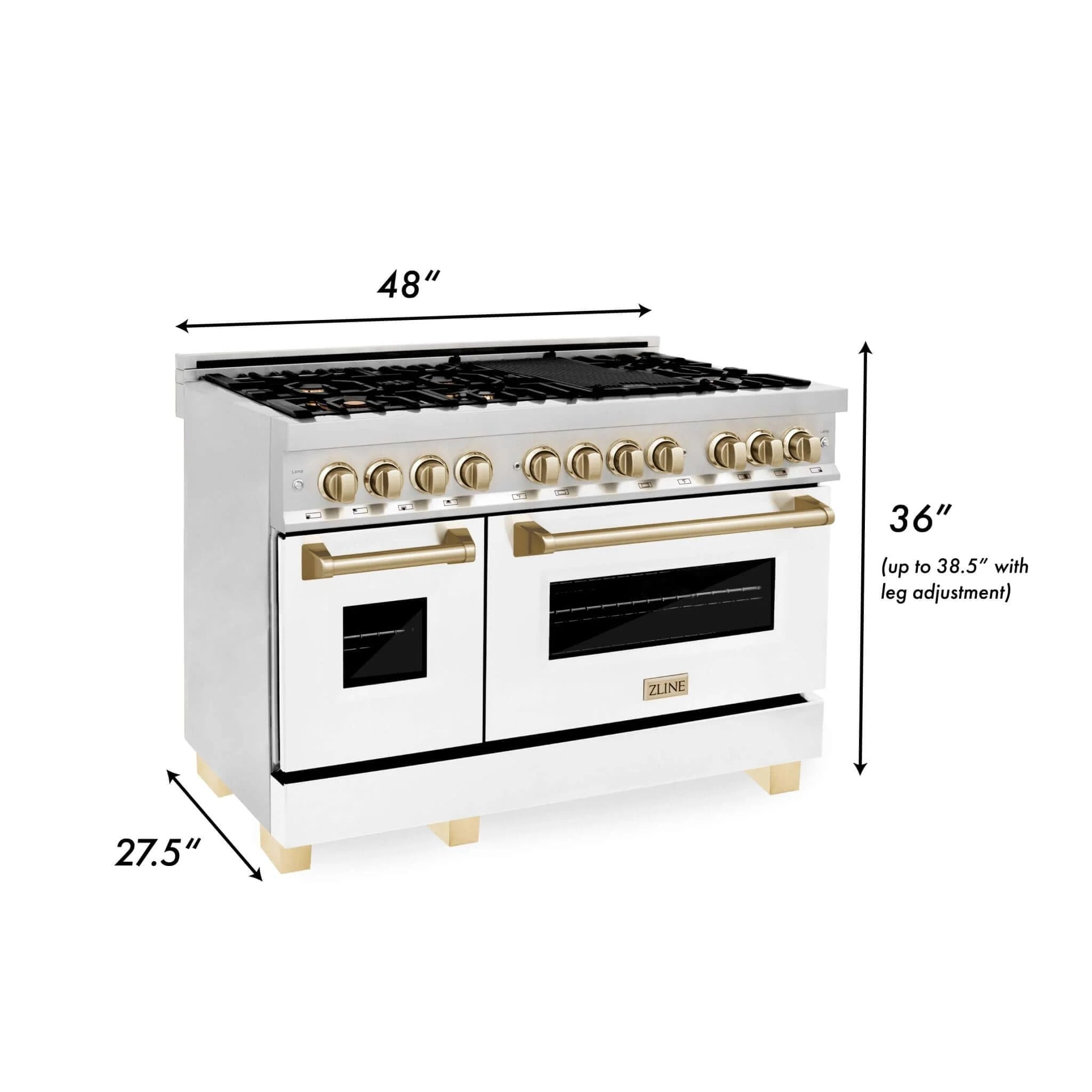 Luxury isn’t meant to be desired - it’s meant to be attainable. The ZLINE Autograph Edition 48 in. 6.0 cu. ft. Legacy Dual Fuel Range with 7 Burner Gas Cooktop and 2 Electric Ovens in Stainless Steel with White Matte Doors and Champagne Bronze Accents (RAZ-WM-48-CB) pairs a powerful gas cooktop with 7 Italian-crafted burners, a large electric convection oven, a small bake and broil oven, beautiful white matte doors with Landscape window designs, and elegant champagne bronze knobs and handles. With innovative features designed to enhance your kitchen’s capability, ZLINE Legacy Dual Fuel Ranges provide a professional culinary experience by pairing unmatched performance with timeless style.