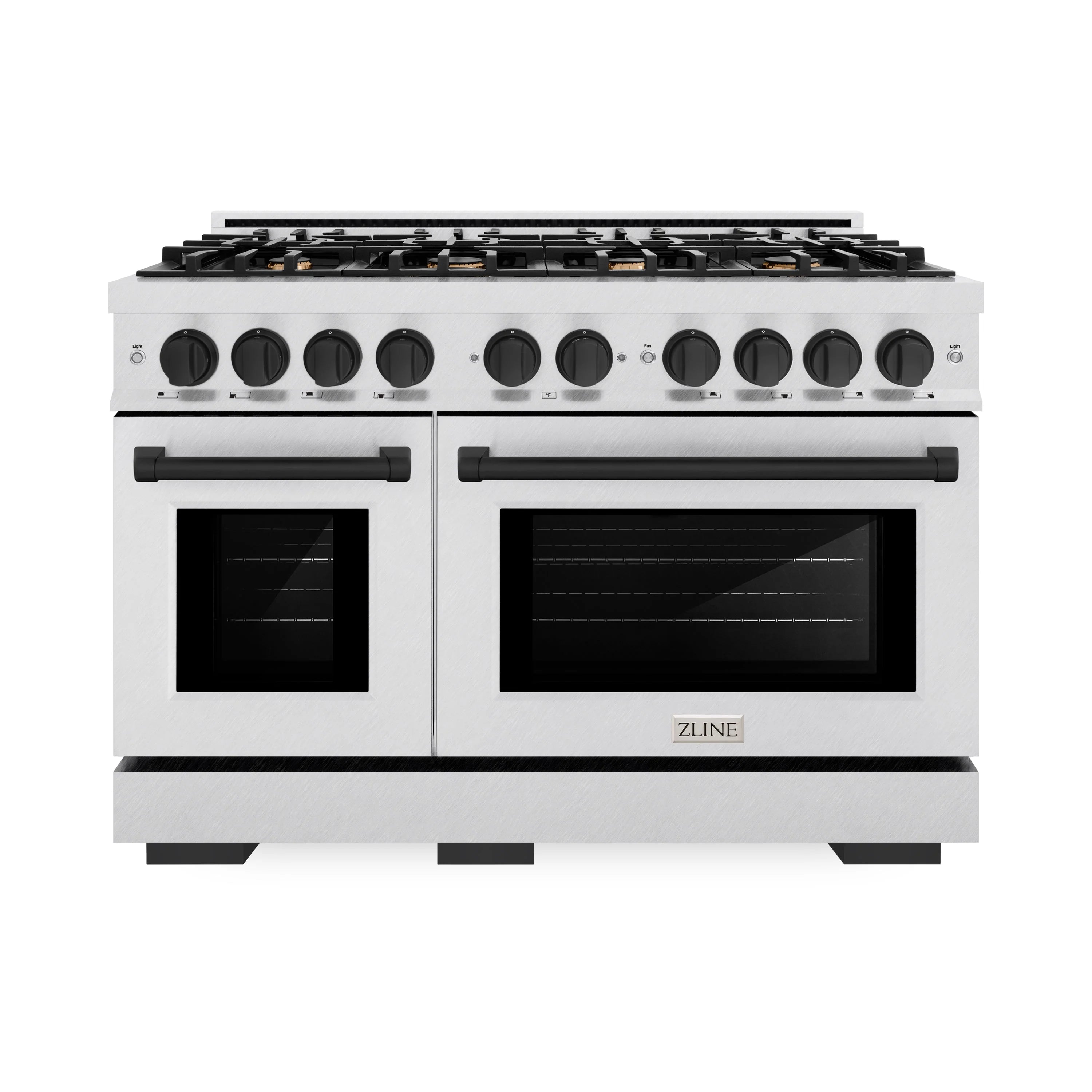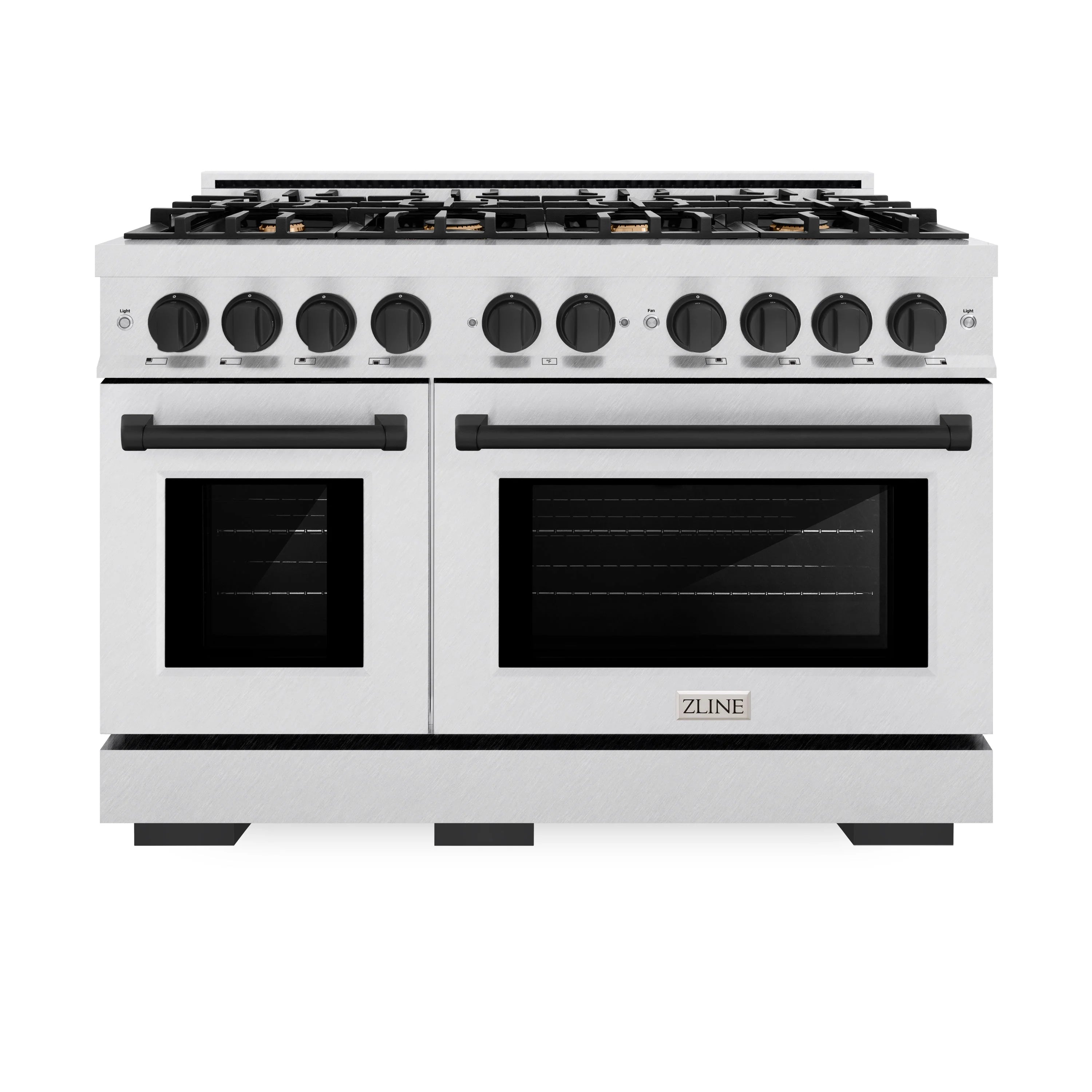 Luxury isn’t meant to be left desired—it’s meant to be attainable. The ZLINE Autograph Edition 48 in. 6.7 cu. ft. Select Double Oven Gas Range with 8 Burner Cooktop in Satin Stainless Steel and Matte Black Accents (HGRSZ-48-MB) combines the elegance of a hand-finished porcelain gas cooktop with 8 Italian-made auto-reignition burners, a large gas convection oven with an energy-efficient cooling fan to ensure quiet operation, a small baking oven, Horizon oven door window designs, and stunning matte black knobs and handles allowing you to master every meal. With a modern, timeless style and refined functionality, ZLINE Select Gas Ranges are masterfully crafted to deliver an elevated culinary experience.